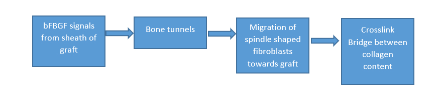 Due to BMP-2 and BMP-7, bone regrows like after fracture and helps repair graft to bone. Type 3 collagen is formed when basic fibroblast growth factors from the graft margin signal the bone tunnels to migrate spindle-shaped fibroblasts towards the graft to form a crosslink bridge and strengthen the graft and bone bond. These fibres are different in arrangement and diameter from pre-injury ACL fibres.