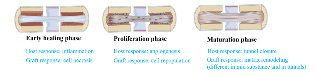 2. Early healing phase saw the accumulation of neutrophils, TGFs, TNFs, macrophages, and IL-6 near the implanted graft. Many researchers believe that this graft underwent A-vascular necrosis, which started a cascade of growth factors due to cytokines released inside the tendon graft, while the outer side, exposed to synovial fluid with growth inhibiting factors, interferes with healing and causes massive collagen necrosis and disorganisation NSAIDs may impede ACL graft healing, according to recent research.